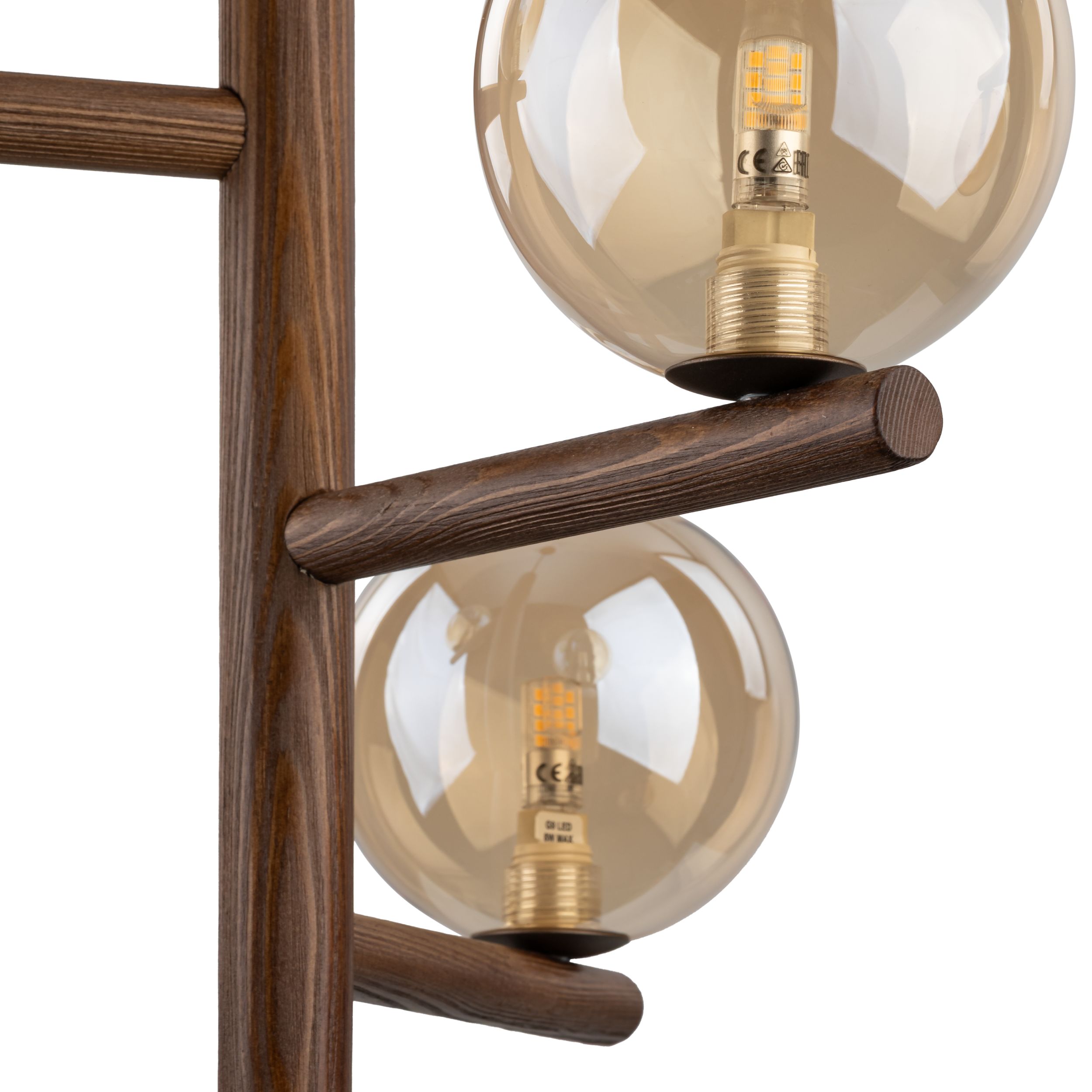 Trzy szklane klosze w kolorze bursztynowym subtelnie rozpraszają światło, tworząc przytulną atmosferę w pomieszczeniu. Wykończenie w kolorze orzecha nadaje lampie naturalny charakter i sprawia, że doskonale komponuje się z drewnianymi elementami wystroju.