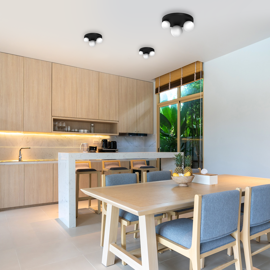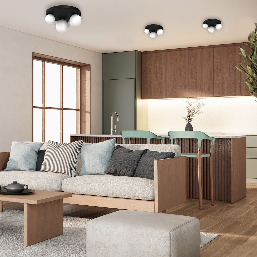 W tej konstrukcji biały klosz przylega bezpośrednio do czarnego, okrągłego lub podłużnego mocowania tuż pod sufitem. W ofercie znajdują się dwie opcje kolorystyczne - wspomniane mocowanie może być w kolorze czarnym lub złotym.