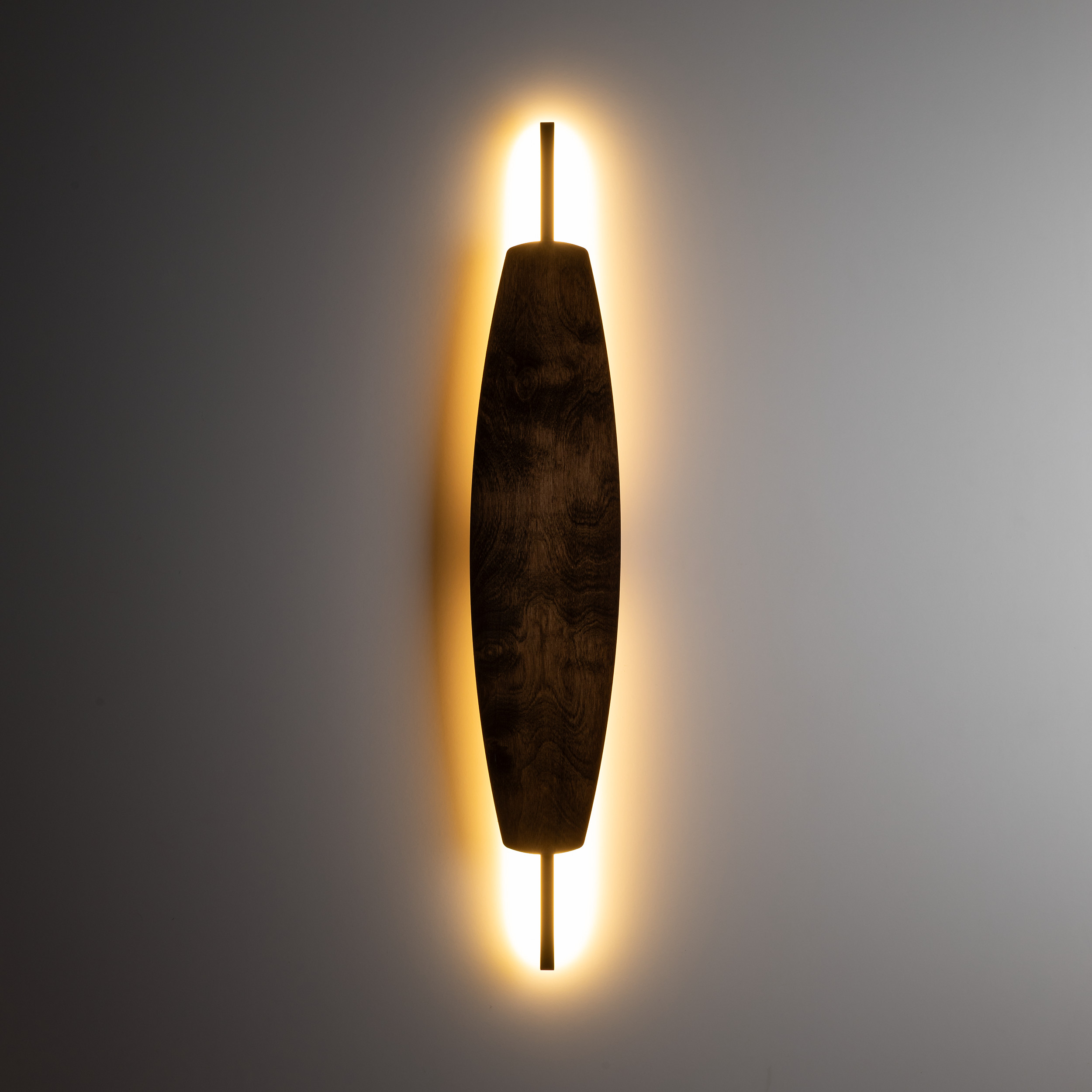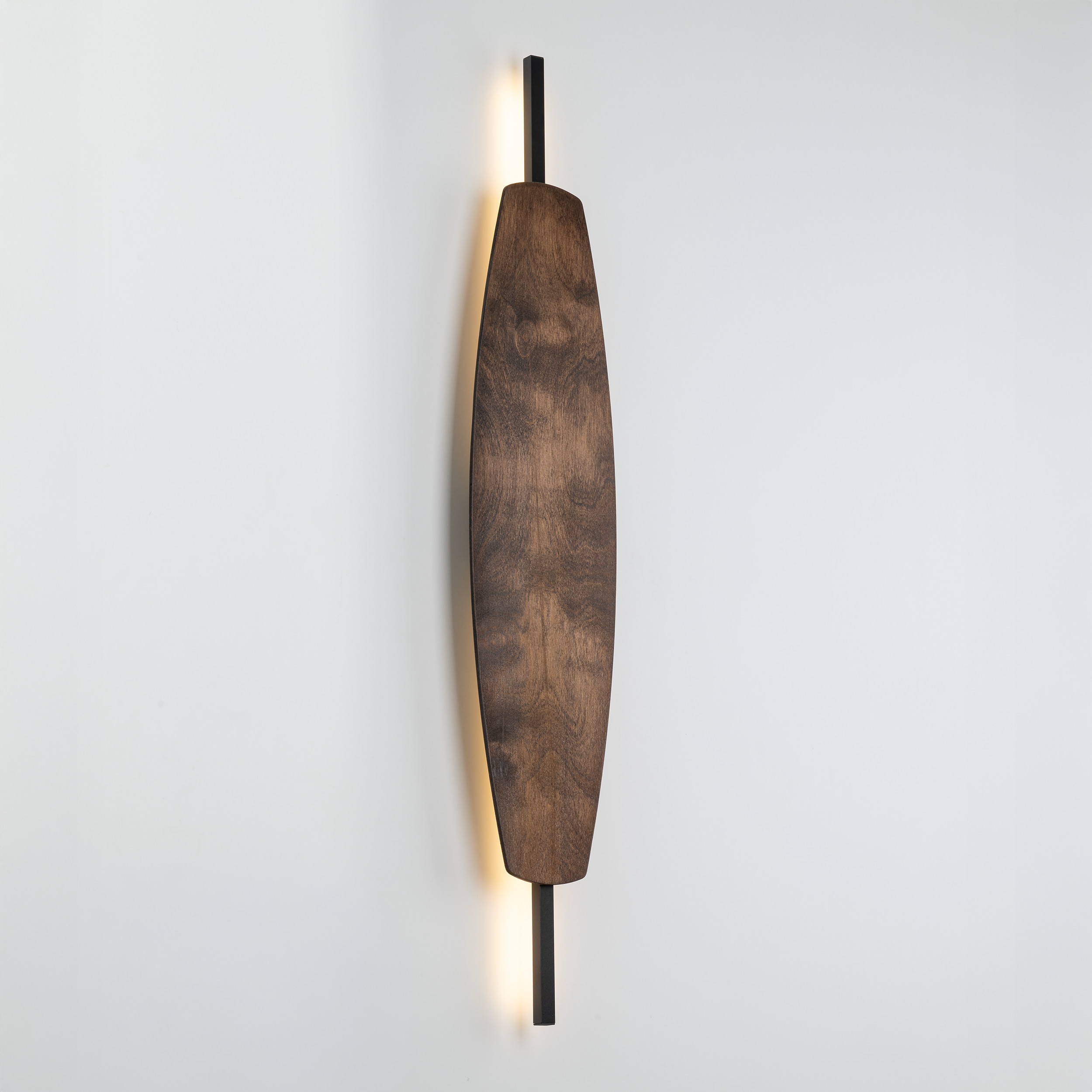 MAREWA to elegancka rodzina dekoracyjnych kinkietów, które łączą prostotę formy z ciepłem naturalnego wykończenia. Smukły, pionowy profil w czerni został zestawiony z długim, delikatnie wyoblonym panelem ze sklejki w kolorze orzecha. Organiczny kształt przywodzi na myśl liść lub deskę wiosła, dzięki czemu lampa staje się subtelną, a jednocześnie wyrazistą ozdobą ściany. Światło ukryte za panelem miękko rozlewa się po tle, tworząc nastrojową poświatę idealną do strefy wypoczynku. Rodzina dostępna jest w dwóch rozmiarach: MAREVA M – jako smukły akcent świetlny oraz MAREVA L – bardziej wyrazista, wydłużona forma, która świetnie sprawdzi się pojedynczo lub w kompozycjach po kilka sztuk. Kinkiety MAREVA doskonale uzupełnią aranżacje nowoczesne, loftowe i inspirowane naturą, wprowadzając do wnętrza przytulny klimat oraz elegancki detal w odcieniu orzechowego drewna.