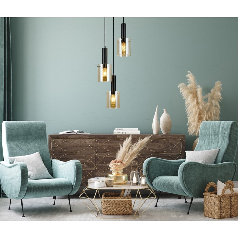 Lampa Sardo w wersji potrójnej łączy czarną metalową oprawę z bursztynowymi kloszami (amber), tworząc elegancki i nastrojowy efekt. Ciepłe szkło pięknie rozprasza światło, wprowadzając przytulny klimat w salonie, jadalni, sypialni lub nad wyspą kuchenną.